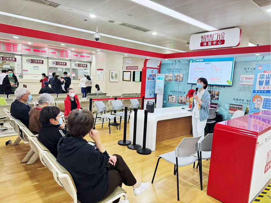 在推進(jìn)新技術(shù)應(yīng)用的同時,華山醫(yī)院考慮到目前還不能熟練使用智能設(shè)備的老年患者,開設(shè)智慧門診長者中心,教老人學(xué)習(xí)“掌上就醫(yī)”